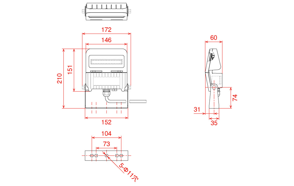 | 材質 | 本体/ADC(アルミダイカスト) 前面パネル/ガラス 反射板/PC(ポリカーボネート) 取付枠/SUS(ステンレス) ボルト/SUS(ステンレス) |