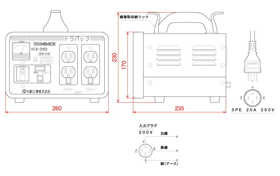 電圧降下が少なく、200V電源から安定した100Vを供給できます。