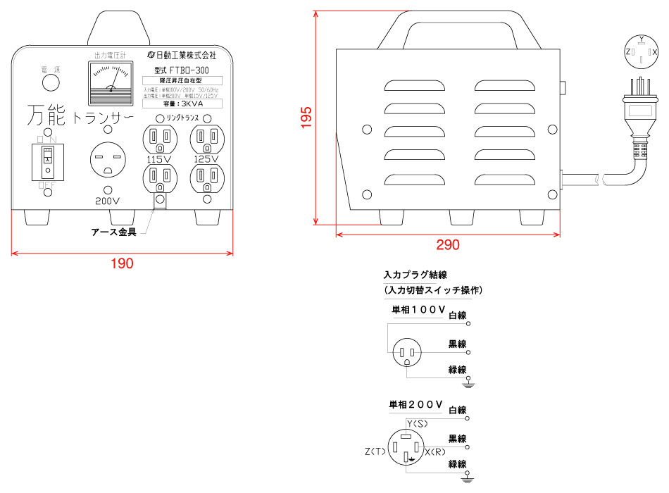 | 入力プラグ | 三相200V接地3P20A250V (付属交換プラグ:100V接地2P15A125V)  |
