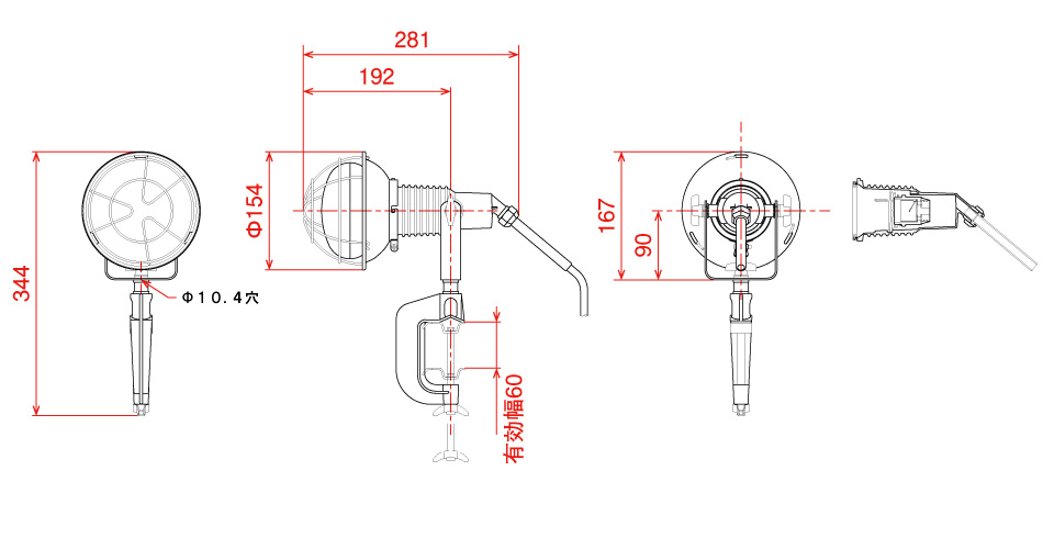 屋内・屋外兼用、AC200V専用、作業用白熱球投光器です。