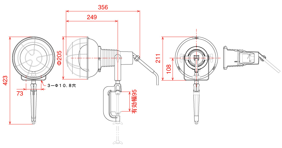 屋内・屋外兼用、AC200V専用、作業用白熱球投光器です。