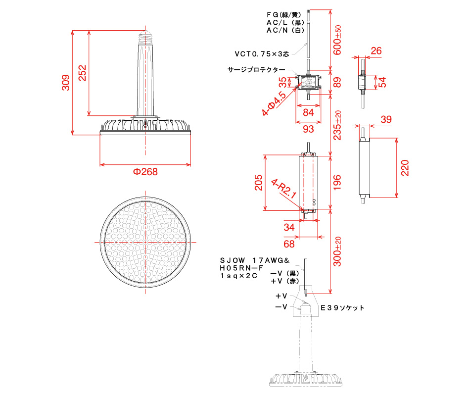 電線種 | 電源装置 1次側/VCT 0.75mm²✕3心 2次側/17AWG✕2心 |