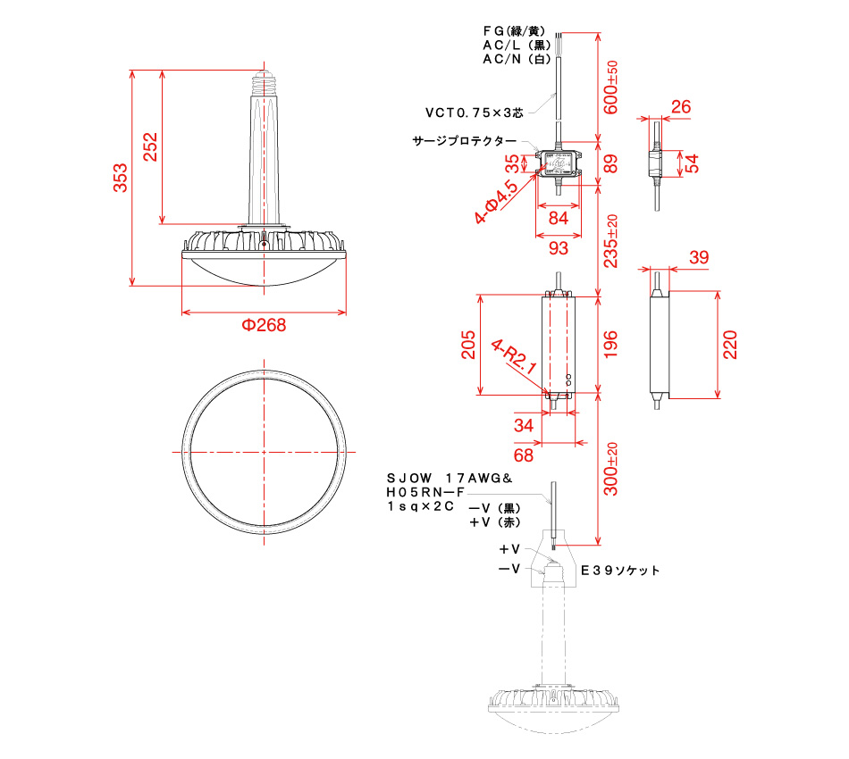電線種 | 電源装置 1次側/VCT 0.75mm²✕3心 2次側/17AWG✕2心 |