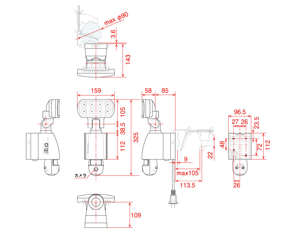首振り角度 | ライト:左右80度 下向き45度 カメラ:左右90度 下向き30度 |
