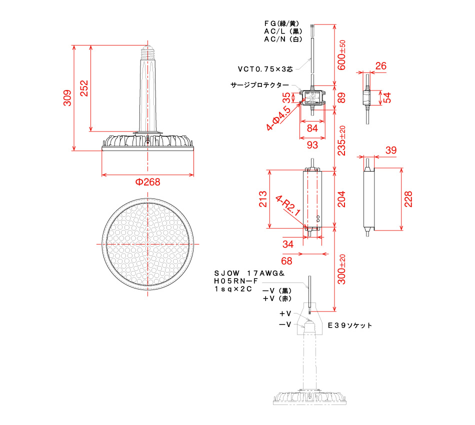材質 | 冷却フィン/ADC(アルミダイカスト) 電源カバー/ADC(アルミダイカスト) フロント枠・レンズ/PC(ポリカーボネイト) |
